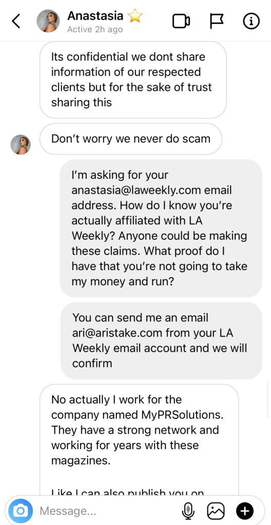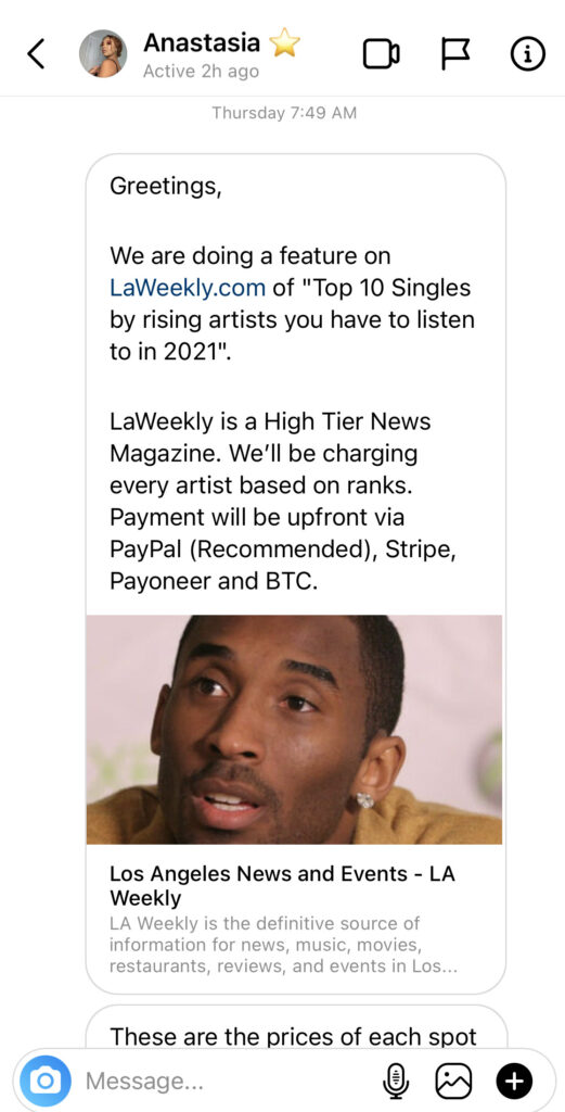 After I asked her for some assurances that this was not a scam or to email me from her @LAWeekly.com email address or to link me to some previous placements they’ve done with the LA Weekly. She included screenshots of DMs with another musician. Like, because you scammed another musician, that’s supposed to give you legitimacy?