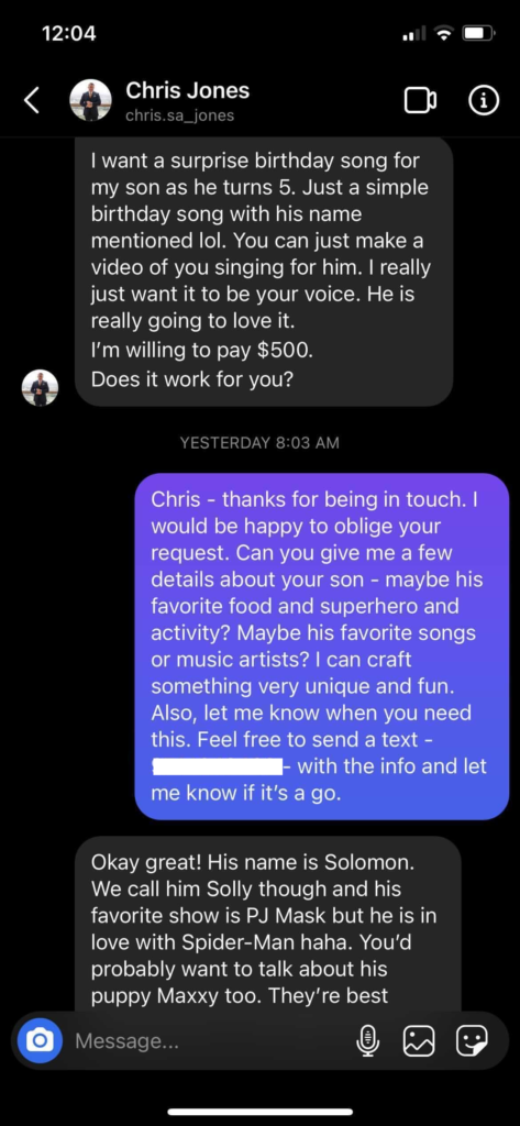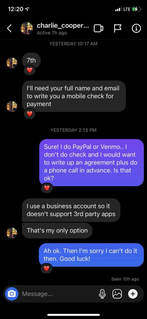 So, to all the artists out there, keep your guards up. Your next paycheck ain’t coming from “Chris Jones” or “Ashley Jones” (or “Charlie Cooper”) via an Instagram DM for their dog Maxxy Pad.