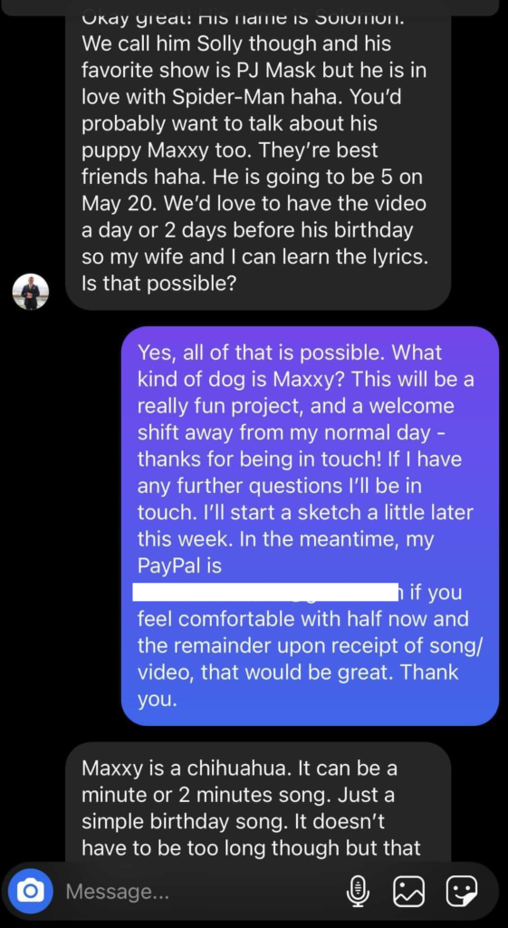 And if the songwriter responds with “Venmo or PayPal only” the scammer will explain that they use a business account which doesn’t work with “3rd party apps” Um, PAYPAL AND VENMO WORK WITH BUSINESS ACCOUNTS – Duh!